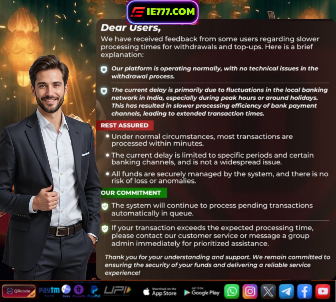 IE777 Game uses secure systems to protect user data and transactions. As a result, gamers can enjoy their gaming with full confidence, knowing that personal information is handled with care and safety is treated as of paramount importance. This makes IE777 the trusted choice for many in India.